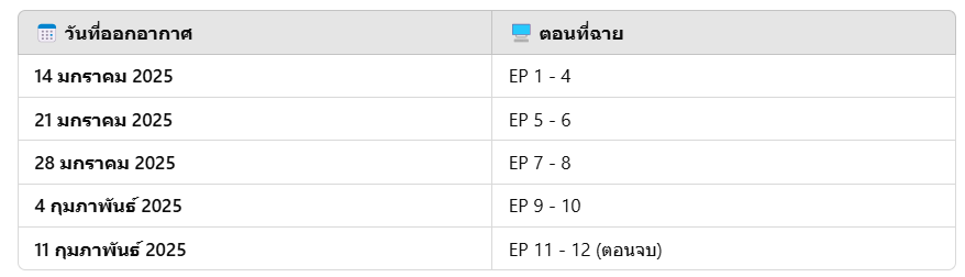 • ตอนสุดท้าย (EP 12) ออกอากาศวันที่ 11 กุมภาพันธ์ 2025