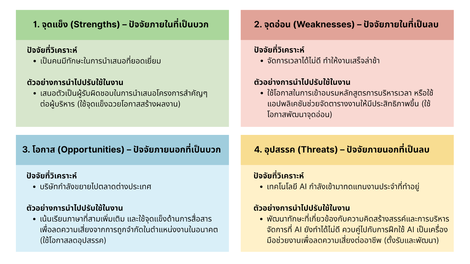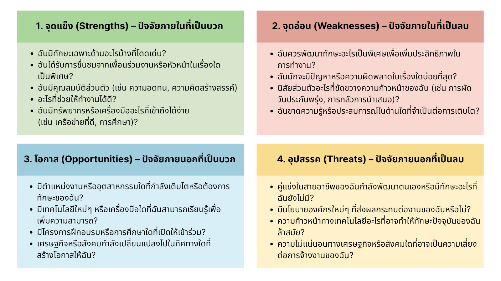 การวิเคราะห์ SWOT ของตัวเองอย่างเป็นระบบจะแบ่งเป็น 2 ส่วนหลักคือ ปัจจัยภายใน (Strengths และ Weaknesses) และ ปัจจัยภายนอก (Opportunities และ Threats):